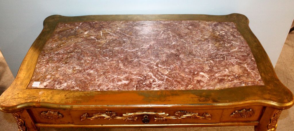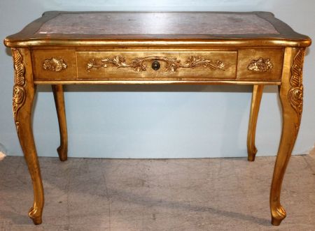 Gold finished marble insert writing desk.; 42" w., 30" h., 25" d. Gold finished marble insert writing desk.; 42" w., 30" h., 25" d.