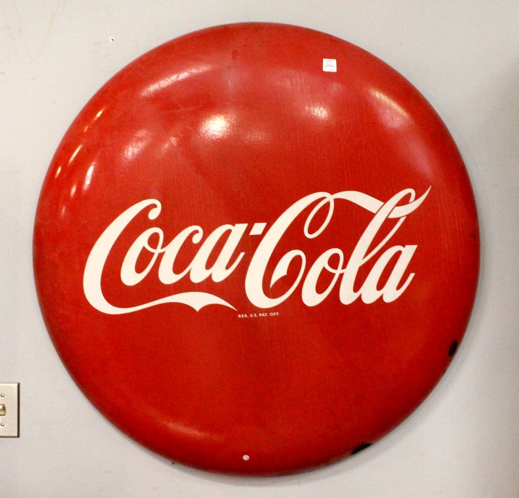 1950's porcelain metal Coca-Cola button sign.; 36" dia. 1950's porcelain metal Coca-Cola button sign.; 36" dia.