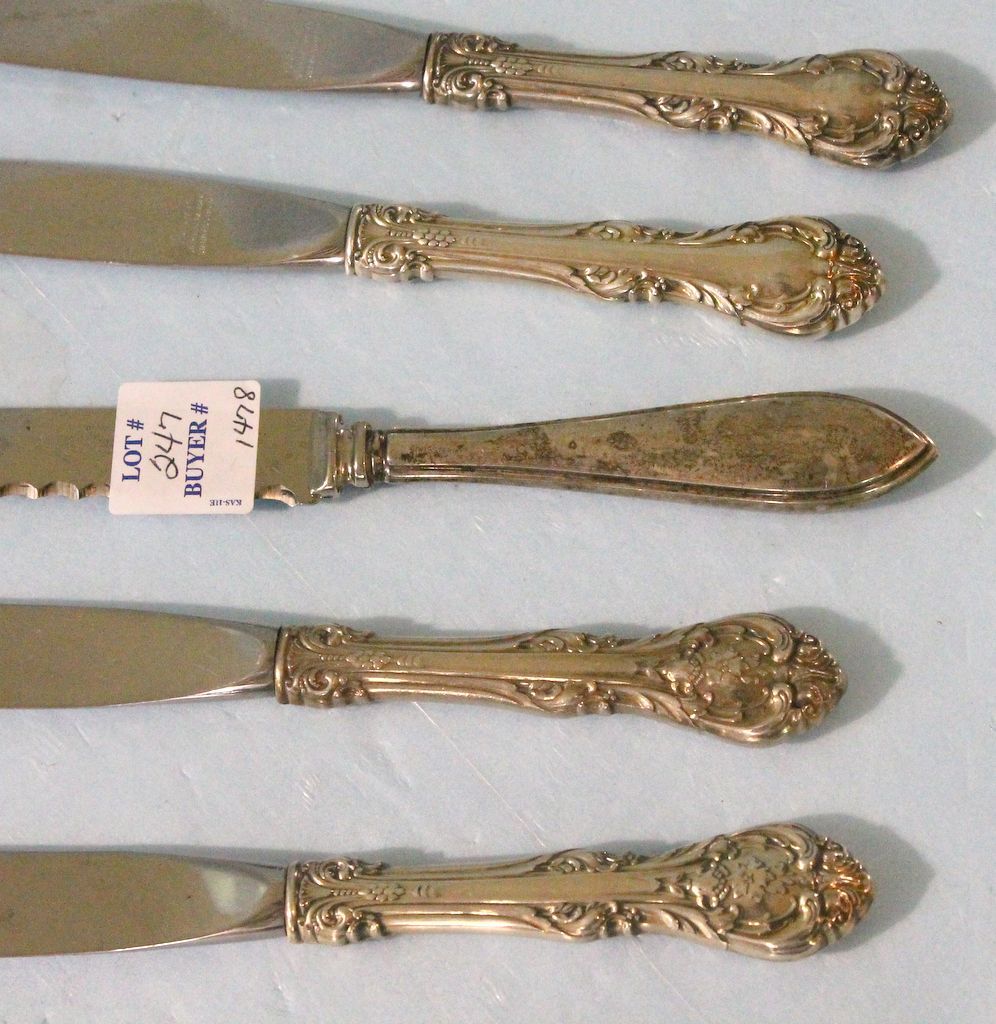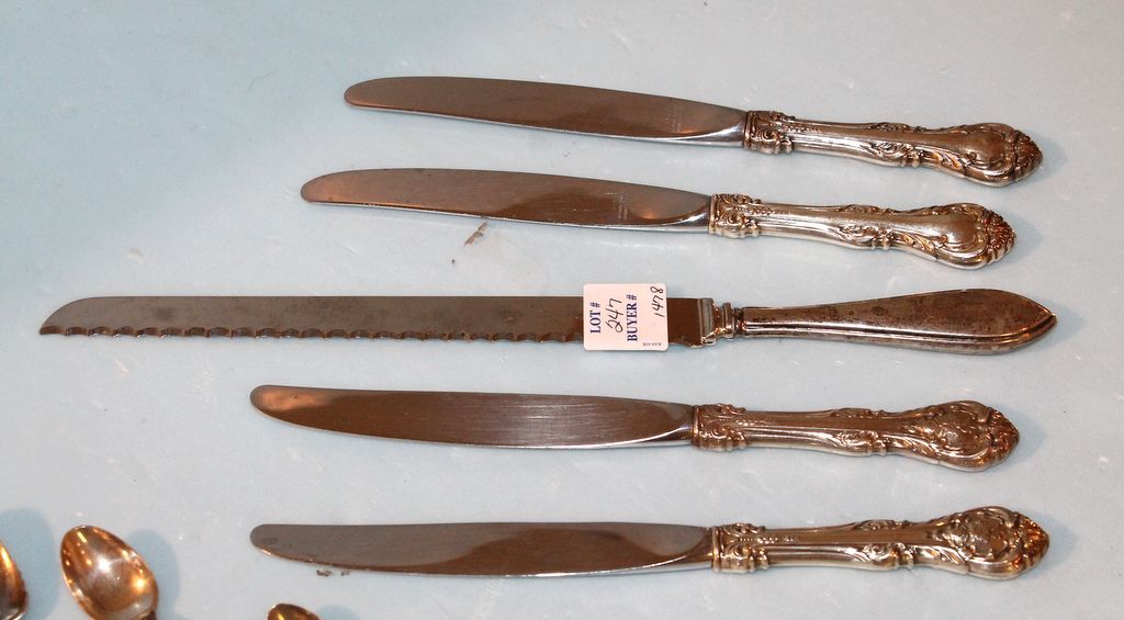 Sterling demi-tesse spoon, Sheffield blade, sterling handle cake knife, four sterling handle stainless steel blade Gorham dinner knives, sterling Whiting and Company jelly spoon, and six decorative small serving pieces, weighs 5.16 ozt. Sterling demi-tesse spoon, Sheffield blade, sterling handle cake knife, four sterling handle stainless steel blade Gorham dinner knives, sterling Whiting and Company jelly spoon, and six decorative small serving pieces, weighs 5.16 ozt.