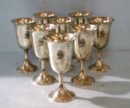 Set of eight N.S. Company sterling goblets with monogram S. Small dent in three.; 6 1/2" h., weighs 31.515. Set of eight N.S. Company sterling goblets with monogram S. Small dent in three.; 6 1/2" h., weighs 31.515.