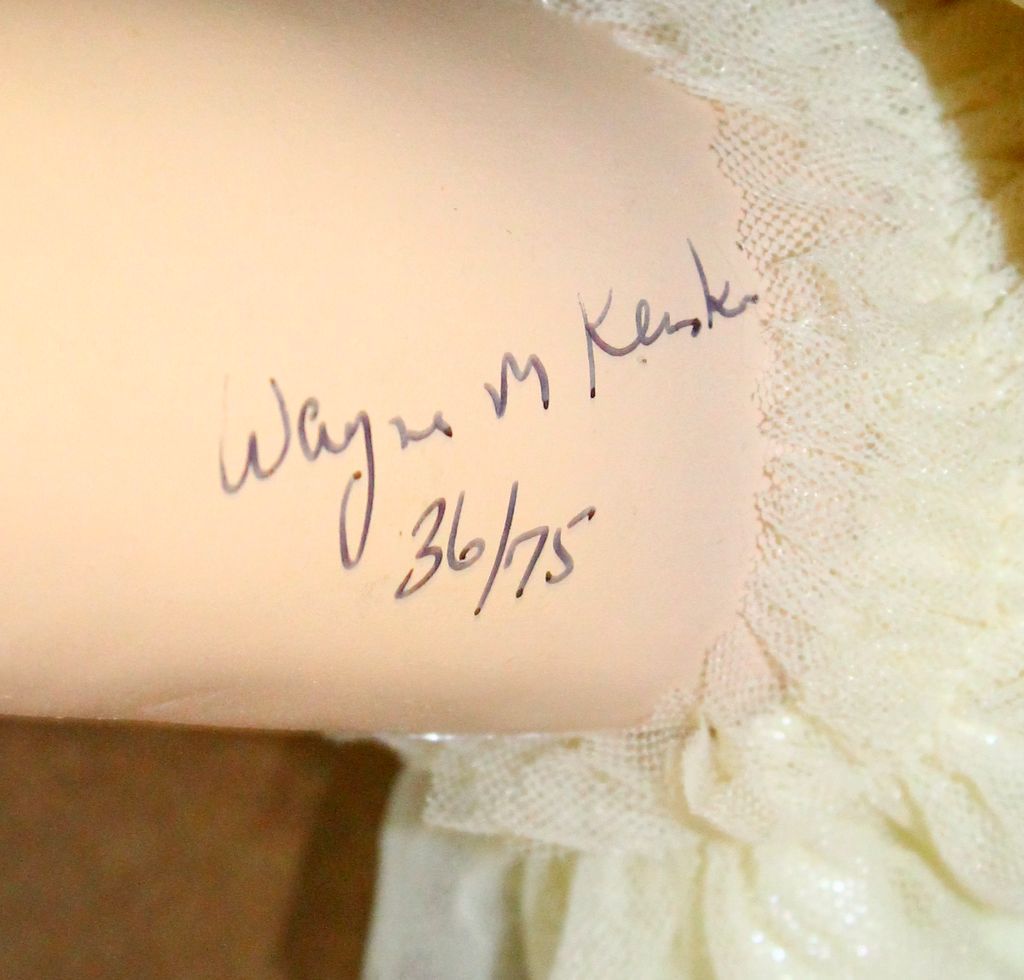 Katherine's Collection Destiny Rose fairy doll, 36/75 signed on leg by artist Wayne Kleski. She is designed to sit, has exceptional clothing, body is hand painted.; 16" tall (not including wings) 22" w. Katherine's Collection Destiny Rose fairy doll, 36/75 signed on leg by artist Wayne Kleski. She is designed to sit, has exceptional clothing, body is hand painted.; 16" tall (not including wings) 22" w.