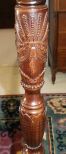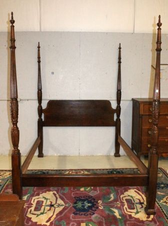 Simple queen size mahogany bed with four rice carved posts.; 88" w. Simple queen size mahogany bed with four rice carved posts.; 88" w.
