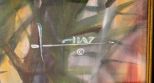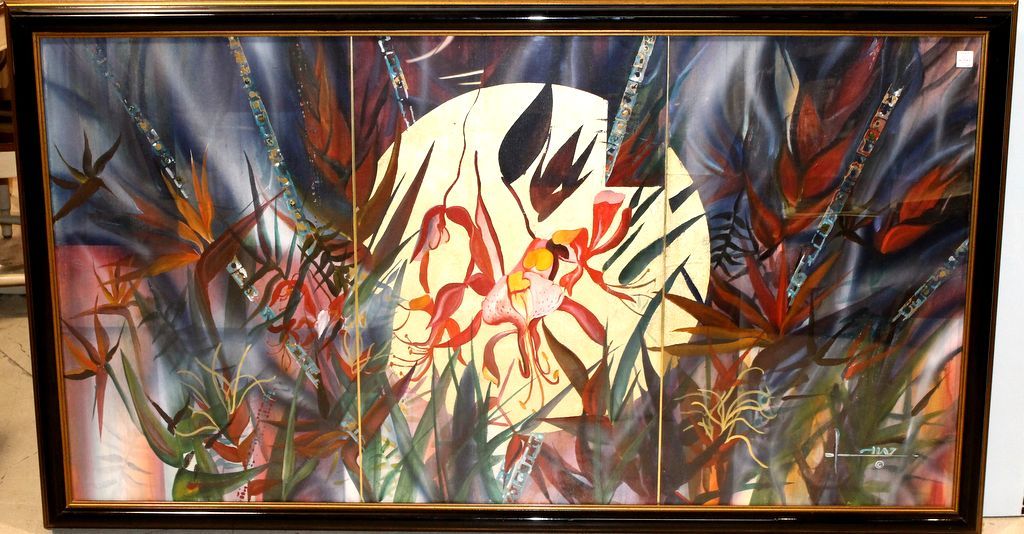 Mixed media tropical painted scene by Jackson artist Luis Diaz.; 64" w., 37" h. Mixed media tropical painted scene by Jackson artist Luis Diaz.; 64" w., 37" h.