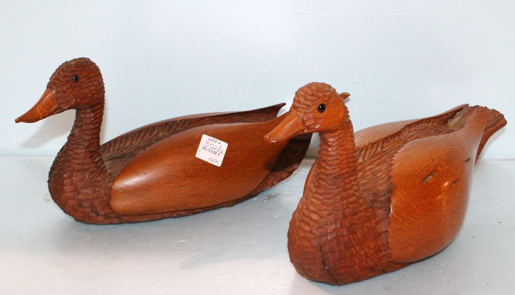 Two hand carved ducks by artist David Ritter. One has broken tail but it is taped to bottom.; 12" l. Two hand carved ducks by artist David Ritter. One has broken tail but it is taped to bottom.; 12" l.