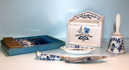 Prill "blue onion" porcelain and stainless cake knife, vienna woods porcelain soap dish, 5 1/2", Di Mauro porcelain dinner bell, set of six prill stainless and porcelain steak knives, painted "blue onion" recipe box Prill "blue onion" porcelain and stainless cake knife, vienna woods porcelain soap dish, 5 1/2", Di Mauro porcelain dinner bell, set of six prill stainless and porcelain steak knives, painted "blue onion" recipe box