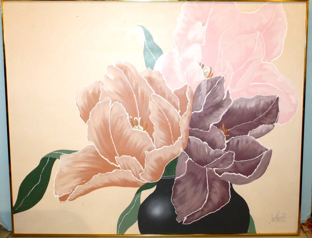 Large oil painting of tulips signed Lee Reynolds; 60" w., 48" h. Large oil painting of tulips signed Lee Reynolds; 60" w., 48" h.