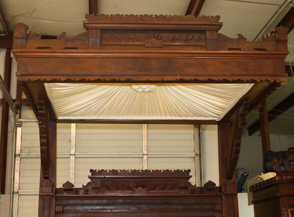 Eastlake walnut, half tester bed with burl walnut panels and fancy floral carving. Mattress and bedding not included. 54" w., 72" long, 110" h. Eastlake walnut, half tester bed with burl walnut panels and fancy floral carving. Mattress and bedding not included. 54" w., 72" long, 110" h.