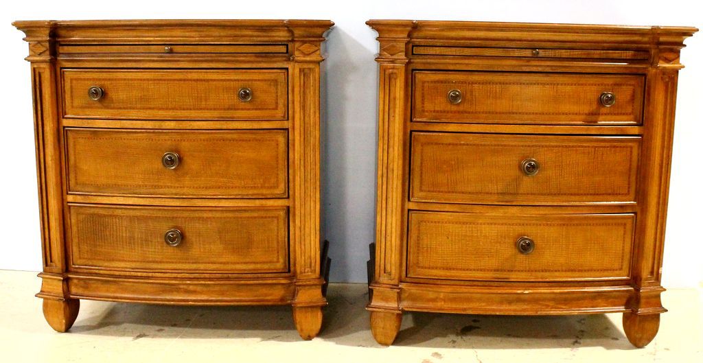 Pair contemporary three drawer bedside tables with inlay top; 33 1/2" w., 16 1/2" d., 34" h. Pair contemporary three drawer bedside tables with inlay top; 33 1/2" w., 16 1/2" d., 34" h.