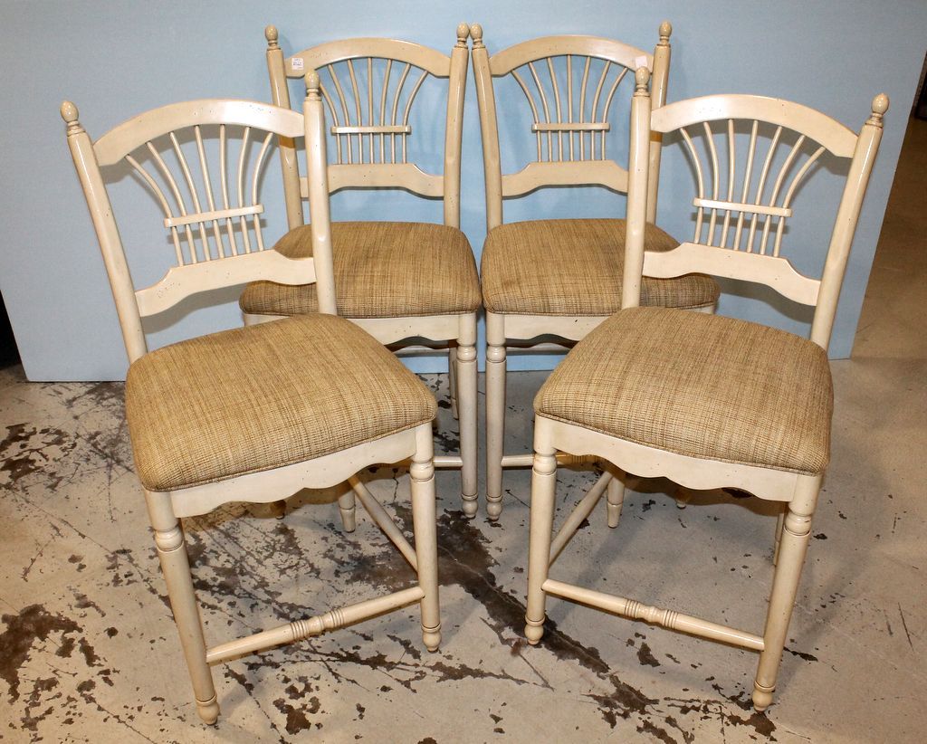 Set of four "shabby chic" bar chairs. Matches previous lot; 19" w., 17" d., 41" h. Set of four "shabby chic" bar chairs. Matches previous lot; 19" w., 17" d., 41" h.