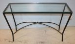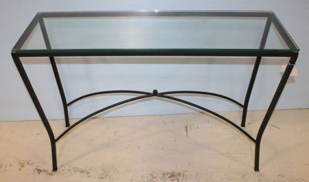 Woodstock glass top, iron base console table.; 46" w., 15" d., 30" h. Woodstock glass top, iron base console table.; 46" w., 15" d., 30" h.