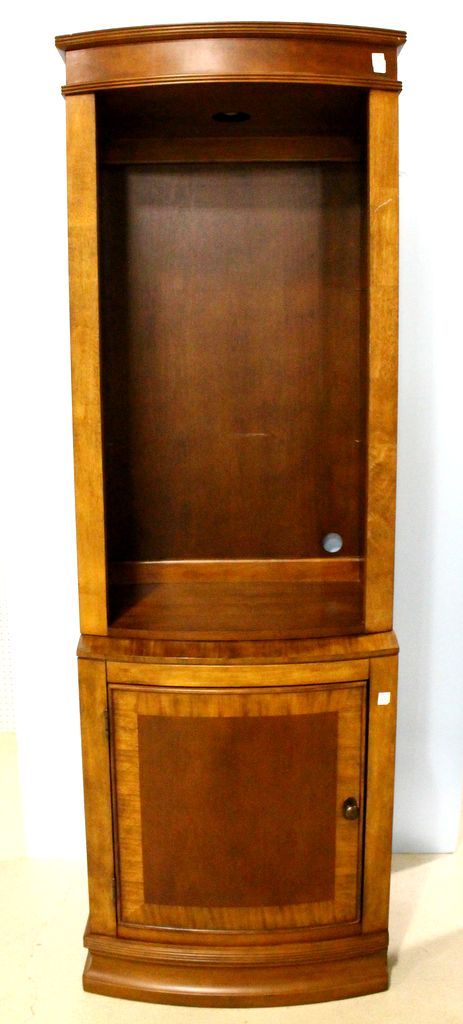Two part contemporary cabinet, top section with shelves, bottom section with door, banding on base, lighted.; 27" w., 15 1/2" d., 79 1/2" h. Two part contemporary cabinet, top section with shelves, bottom section with door, banding on base, lighted.; 27" w., 15 1/2" d., 79 1/2" h.