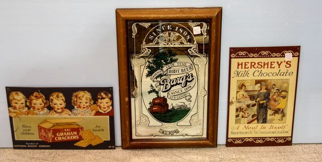 Barq's Root Beer mirror, National Biscuit Company sign and Hershey sign; Signs- 10" w., 16" h. Barq's Root Beer mirror, National Biscuit Company sign and Hershey sign; Signs- 10" w., 16" h.