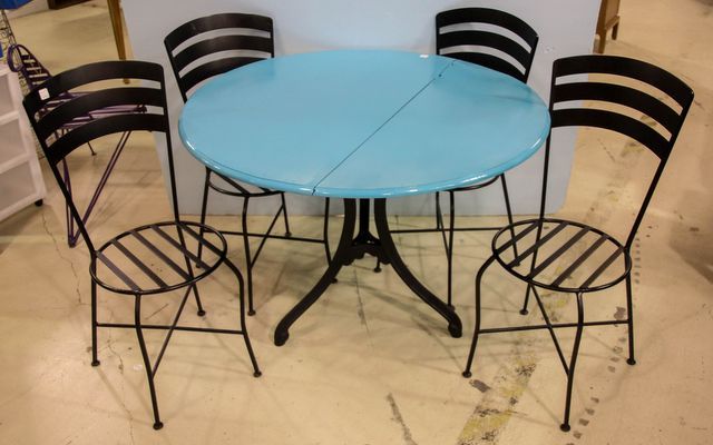 406 Turquoise Wood Top Iron Base Table & Four Metal Chairs
