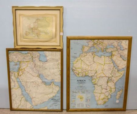 1990 National Geographic Map of Africa 24" w., 30" h., National Geographic map of Middle East 21 1/2" w., 25 1/2" h. and Hammonds' map of Europe 18" w., 15" h. 1990 National Geographic Map of Africa 24" w., 30" h., National Geographic map of Middle East 21 1/2" w., 25 1/2" h. and Hammonds' map of Europe 18" w., 15" h.