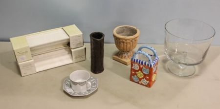 Two 12" display ledge, small porcelain bag, cup/saucer and ceramic vase Two 12" display ledge, small porcelain bag, cup/saucer and ceramic vase