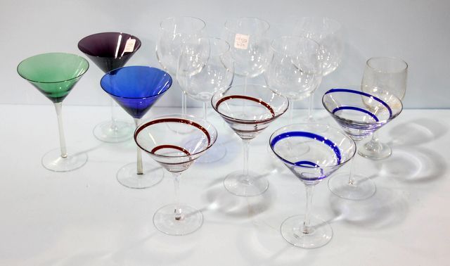 Consists of set of four swirl glass champagne glasses, set of three color champagne glasses and six various clear glasses Consists of set of four swirl glass champagne glasses, set of three color champagne glasses and six various clear glasses