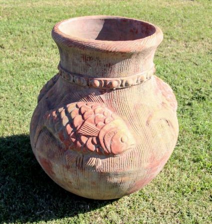 Decorated with fish; 25" dia., 32" h. Decorated with fish; 25" dia., 32" h.