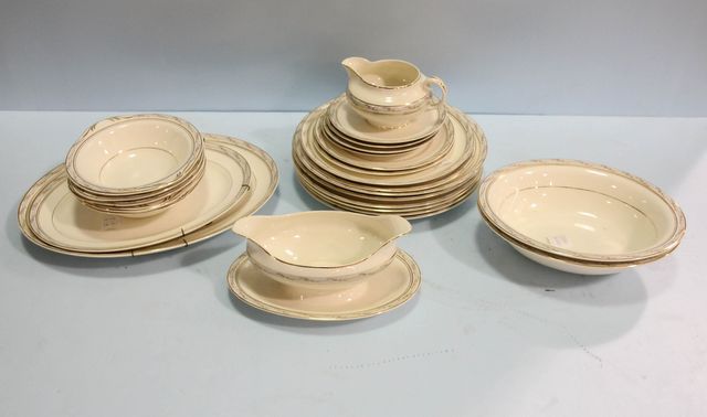 Consists of six dinner plates (chips), two salad plates, two bread/butter plates, three saucers, two vegetables, gravy, creamer, two platters and five soups Consists of six dinner plates (chips), two salad plates, two bread/butter plates, three saucers, two vegetables, gravy, creamer, two platters and five soups