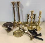 Consists of pair of tall brass candlesticks, two other pairs of brass candlesticks, stand, easels and small compote Consists of pair of tall brass candlesticks, two other pairs of brass candlesticks, stand, easels and small compote