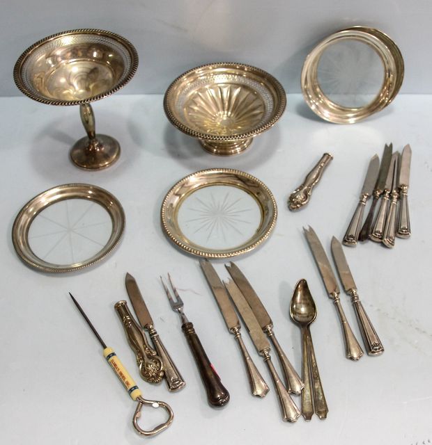 986 Two Sterling Compotes, Four Coasters, Fourteen Small Knives & Spoons