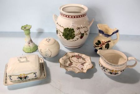 Consists of cookie jar, butter dish, creamer, candle holder, tray and pitcher Consists of cookie jar, butter dish, creamer, candle holder, tray and pitcher