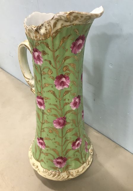 Beautiful Bavarian Style Hand Painted Rose Pitcher, porcelain, gold gilt trim work, tall, German, unmarked, good condition, 15"h., 9"w. Beautiful Bavarian Style Hand Painted Rose Pitcher, porcelain, gold gilt trim work, tall, German, unmarked, good condition, 15"h., 9"w.