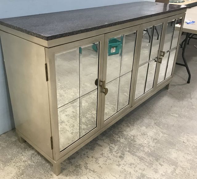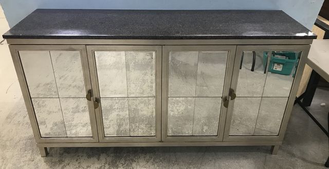 Contemporary Mirrored Sideboard, four door, inner shelves, silver, with faux marble top, heavy piece, beveled mirror panels, top does not come off, 39"h., 73"w., 21"d. Contemporary Mirrored Sideboard, four door, inner shelves, silver, with faux marble top, heavy piece, beveled mirror panels, top does not come off, 39"h., 73"w., 21"d.