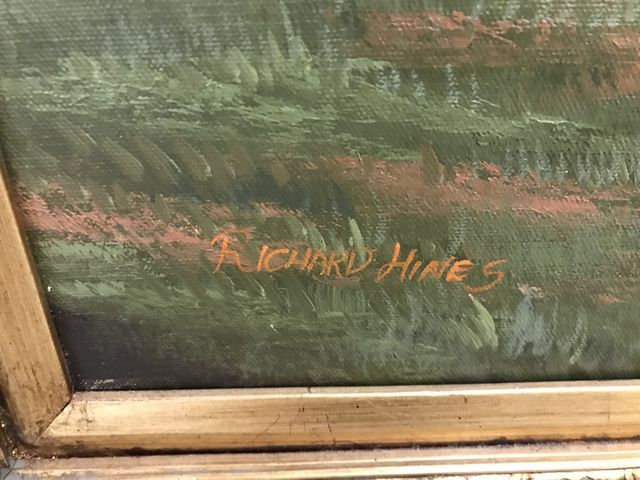 Richard Hines Painting of Horse, oil on canvas, Horse in Pasture, signed Richard Hines, does have small chips in center, gold gilt framed, 25"h., 29"w. Richard Hines Painting of Horse, oil on canvas, Horse in Pasture, signed Richard Hines, does have small chips in center, gold gilt framed, 25"h., 29"w.