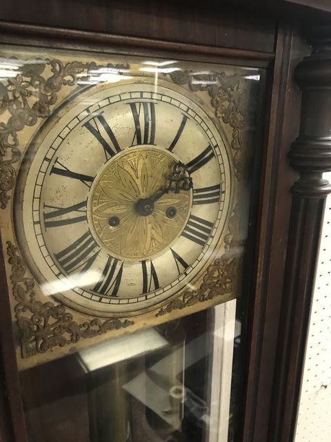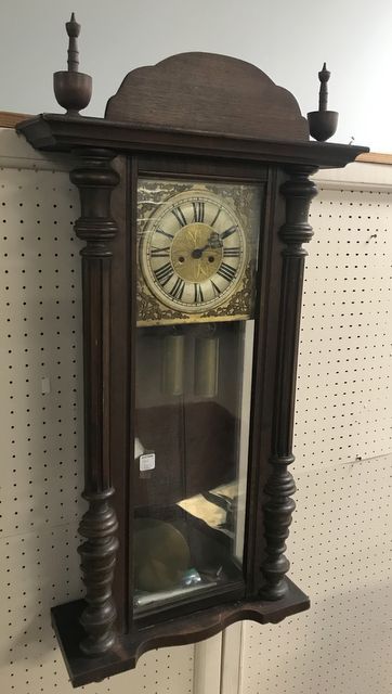 Victorian Style Pendulum Wall Clock, weights, pendulum, has face dial (needs to be attached), glass door, wood case, needs work, 37"h., 17"w. Victorian Style Pendulum Wall Clock, weights, pendulum, has face dial (needs to be attached), glass door, wood case, needs work, 37"h., 17"w.