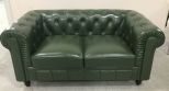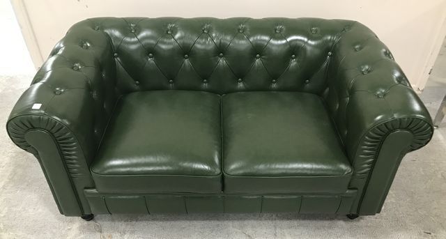 Chesterfield Tufted Love Seat, brown polyester leather, two cushion, modern decor, good condition, 28"h., 60"w. Chesterfield Tufted Love Seat, brown polyester leather, two cushion, modern decor, good condition, 28"h., 60"w.
