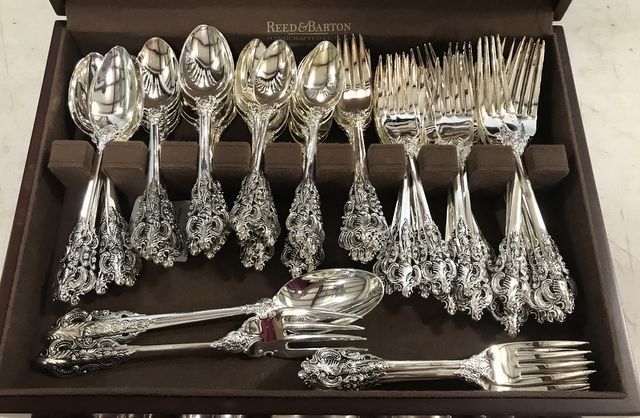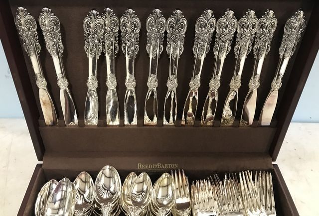 Set Baroque by Goldfinger Silver Plate Flatware Set, 8 place forks, 6 forks, 23 salad forks, 36 spoons, 12 knives, serving spoons, and fork. Reed & Barton flatware box. Set Baroque by Goldfinger Silver Plate Flatware Set, 8 place forks, 6 forks, 23 salad forks, 36 spoons, 12 knives, serving spoons, and fork. Reed & Barton flatware box.