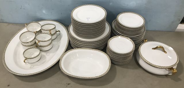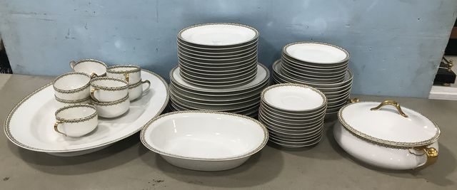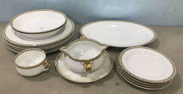 Haviland & Co. "Memphis Queensware Co." China Set, Memphis, Tenn. Haviland France, 8 dinner plates, 12 salad plates, 8 dessert plates, serving platters, 9 bowls (one has small chip), 12 saucers, 10 cups, tureen, also includes: damaged pieces, four dinner plates, platter, cups, gravy boat, four dessert plates. Haviland & Co. "Memphis Queensware Co." China Set, Memphis, Tenn. Haviland France, 8 dinner plates, 12 salad plates, 8 dessert plates, serving platters, 9 bowls (one has small chip), 12 saucers, 10 cups, tureen, also includes: damaged pieces, four dinner plates, platter, cups, gravy boat, four dessert plates.