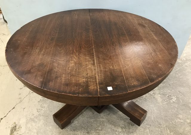 Antique Mission Style Oak Round Dinning Table, single pedestal, on wheels, has some worn areas and veneer missing in spots on top, 30"h., 54"dia. Antique Mission Style Oak Round Dinning Table, single pedestal, on wheels, has some worn areas and veneer missing in spots on top, 30"h., 54"dia.