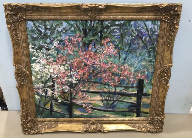 Azaleas Painting on Board by Bettye Bittel, oil paintings, modern gold gilt framed, Florida artist, 28"h., 31"w. Azaleas Painting on Board by Bettye Bittel, oil paintings, modern gold gilt framed, Florida artist, 28"h., 31"w.