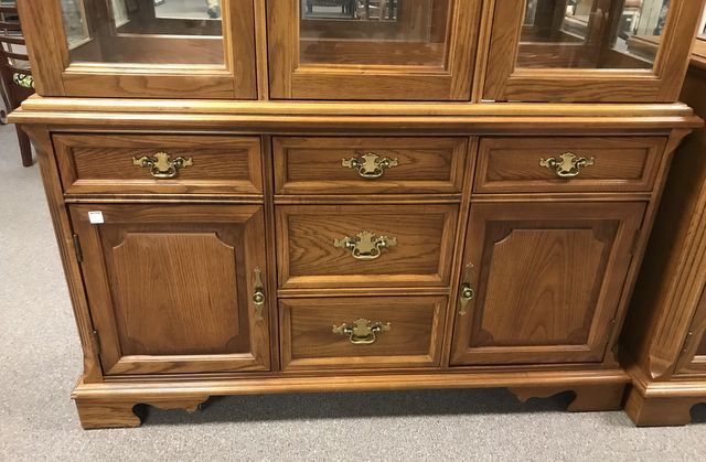 Bassett Oak Finish Cabinet , modern piece, five drawers, side doors storage, lighted, glass panels, 6 glass shelves. Bassett Oak Finish Cabinet , modern piece, five drawers, side doors storage, lighted, glass panels, 6 glass shelves.