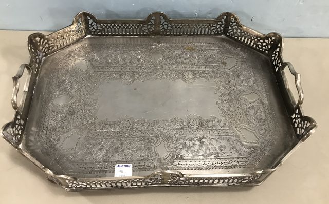 Ornate Silver Plated Footed Tray, ornate border gallery, engraved designs, some tarnish, 4"h., 18"w. Ornate Silver Plated Footed Tray, ornate border gallery, engraved designs, some tarnish, 4"h., 18"w.