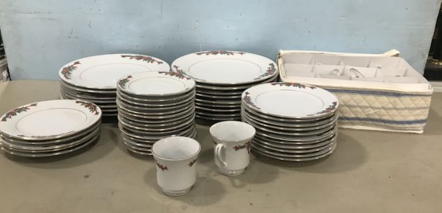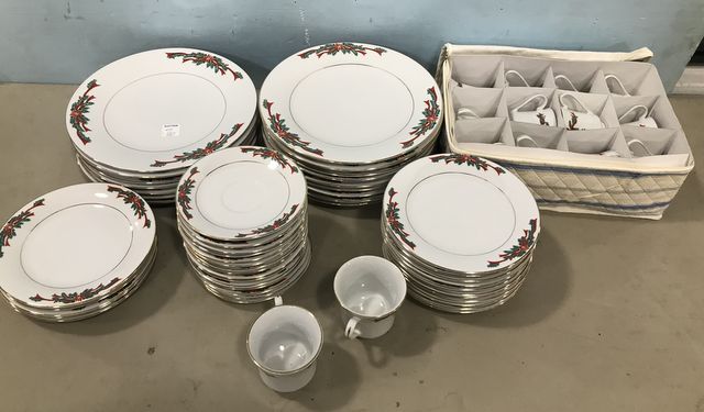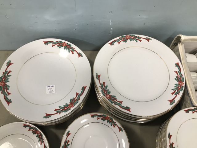 Poinsettia & Ribbons Fine China Set, Christmas china, 16 dinner plates, 16 salad plates, 15 saucers, 14 cups. Poinsettia & Ribbons Fine China Set, Christmas china, 16 dinner plates, 16 salad plates, 15 saucers, 14 cups.