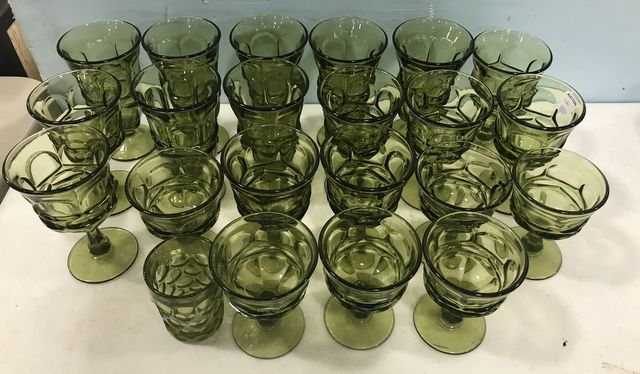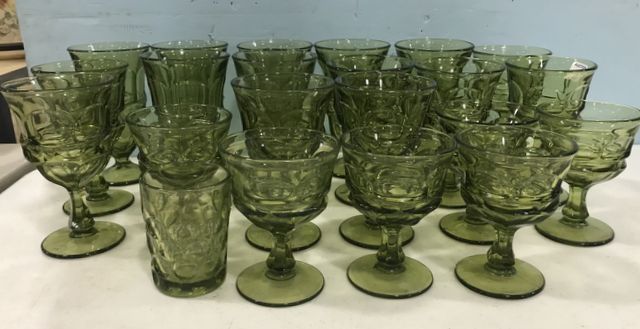 Fostoria Argus Green Glasses, wine glasses, green pattern, 21 total. One has a chip on rim, three piece mold lines, assorted sized. Fostoria Argus Green Glasses, wine glasses, green pattern, 21 total. One has a chip on rim, three piece mold lines, assorted sized.
