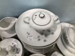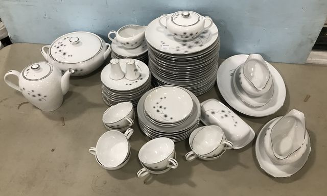 Creative Platinum Star Burst China Set, 22 dinner plates, 12 saucers, 12 dessert plates, 10 bowls, tureen, pitcher, creamer, sugar, butter dish, gravy boat, platter, cups. Creative Platinum Star Burst China Set, 22 dinner plates, 12 saucers, 12 dessert plates, 10 bowls, tureen, pitcher, creamer, sugar, butter dish, gravy boat, platter, cups.