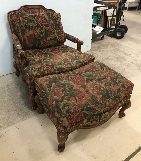 Flexsteel French Style Chair and Ottoman, floral design fabric, vintage, 36"h. Flexsteel French Style Chair and Ottoman, floral design fabric, vintage, 36"h.