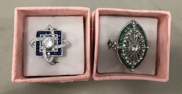 Deco style cocktail ring, size 7, marked .925, clear and blue stones. Deco style cocktail ring, no mark, has rustic wear on band, clear and red stones. Deco style cocktail ring, size 7, marked .925, clear and blue stones. Deco style cocktail ring, no mark, has rustic wear on band, clear and red stones.