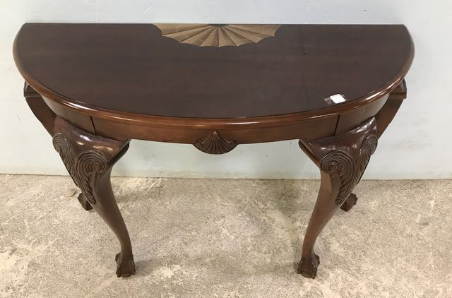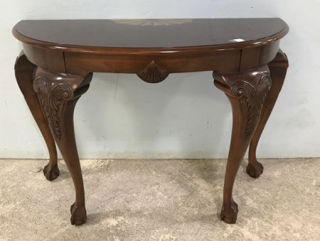 Modern Ball-n-Claw Demi Lune Console Table, inlaid top design, shiny finish, 29"h., 41"w., 16"d. Modern Ball-n-Claw Demi Lune Console Table, inlaid top design, shiny finish, 29"h., 41"w., 16"d.