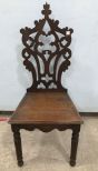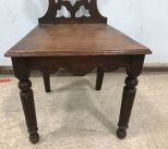 Victorian Style Carved Back Hall Chair, ornate carved back rest, oak wood, dark stain, unique chair, has some small chips, 43"h. Victorian Style Carved Back Hall Chair, ornate carved back rest, oak wood, dark stain, unique chair, has some small chips, 43"h.