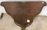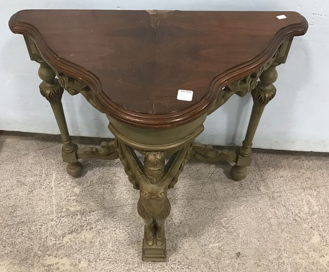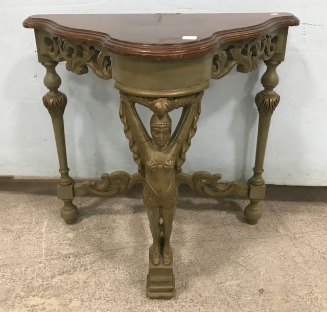 Vintage Demi lune wall stand, carved figural front leg, three leg with carved stretchers, carved border, top has chips, painted base, 24"h., 26"w., 18"d. Vintage Demi lune wall stand, carved figural front leg, three leg with carved stretchers, carved border, top has chips, painted base, 24"h., 26"w., 18"d.