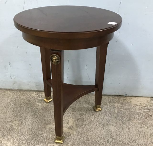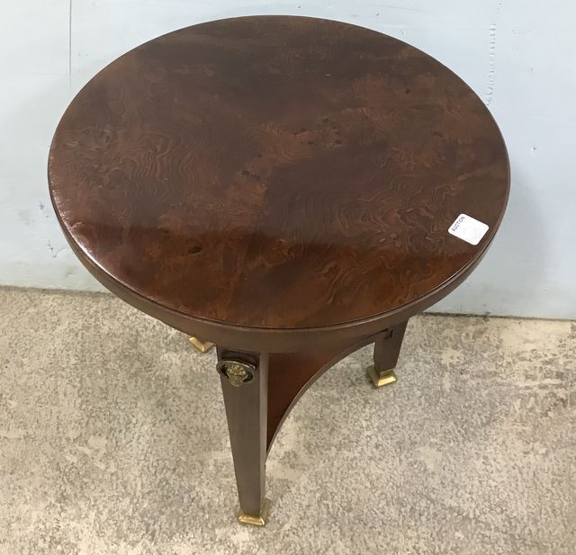 Small French Style Accent Round Table, two tier, burl finish, lion head emblems, brass cap feet, 20"h., 16"w. Small French Style Accent Round Table, two tier, burl finish, lion head emblems, brass cap feet, 20"h., 16"w.
