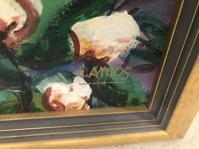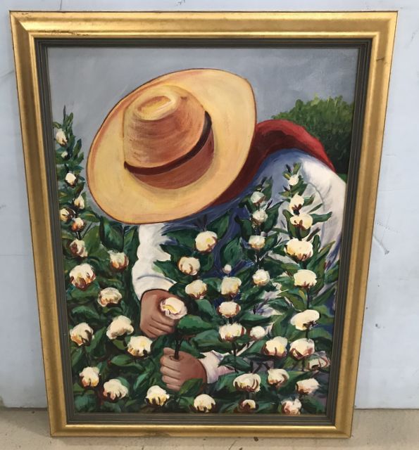 Oil Painting of Board "Cotton Field" by Bonnie Camos, signed, gold gilt framed, 29"h., 22"w. Bonnie is a visual artist, curator, and arts educator, native of Lafayette, Louisiana. Oil Painting of Board "Cotton Field" by Bonnie Camos, signed, gold gilt framed, 29"h., 22"w. Bonnie is a visual artist, curator, and arts educator, native of Lafayette, Louisiana.