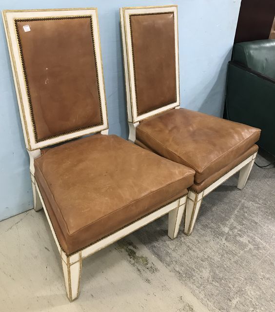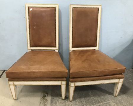 Pair of French Provincial Style Leather Chairs, tan leather, white painted with gold painted trim on frame, has some wear on leather, 42"h. Pair of French Provincial Style Leather Chairs, tan leather, white painted with gold painted trim on frame, has some wear on leather, 42"h.