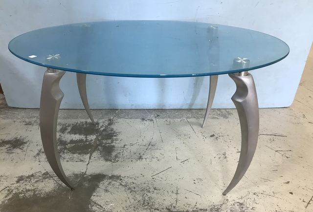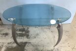 Contemporary Oval Glass Table, blue color top, contemporary metal legs, 30"h., 56"w. Contemporary Oval Glass Table, blue color top, contemporary metal legs, 30"h., 56"w.
