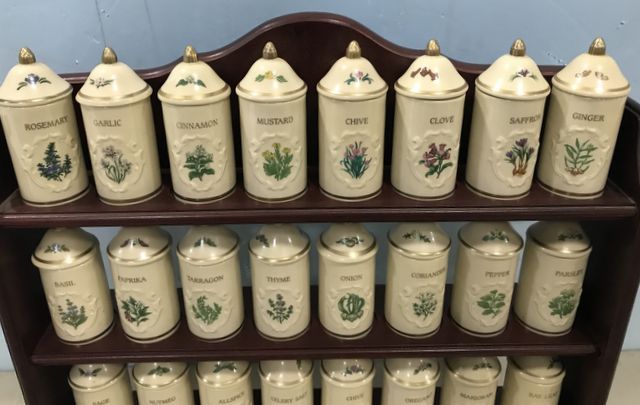 Lenox Spice Garden collection, porcelain spice jars, with wood wall shelf, single drawer, 24 total. Lenox Spice Garden collection, porcelain spice jars, with wood wall shelf, single drawer, 24 total.