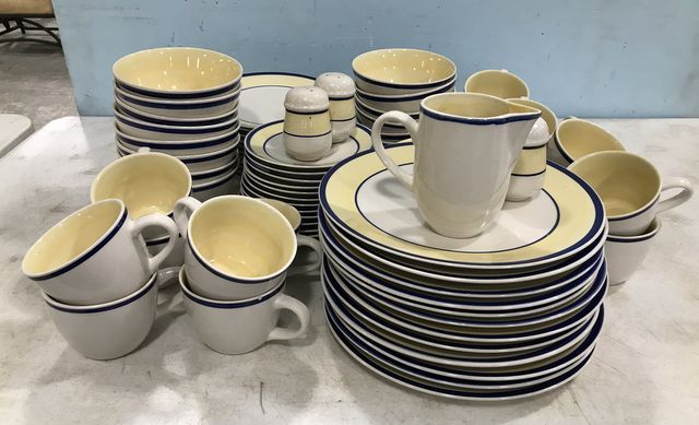 Gibson Everyday Dishware, 12 dinner plates, 10 salad plates, 13 dessert plates, 8 bowls (2 have chips), 3 berry bowls, 7 cups. Gibson Everyday Dishware, 12 dinner plates, 10 salad plates, 13 dessert plates, 8 bowls (2 have chips), 3 berry bowls, 7 cups.
